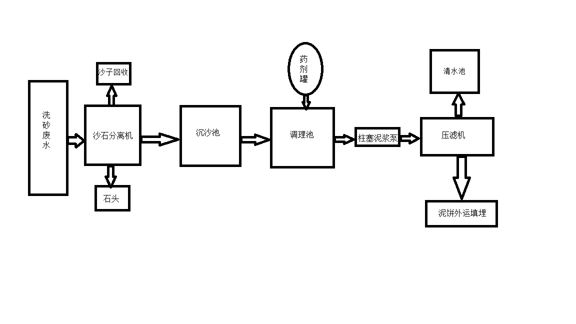 吸砂廢水經(jīng)過沙石分離機(jī),分離1-5公分的顆粒,然后排入沉沙池,沉沙池里必須有攪拌機(jī),經(jīng)過沉沙池由排污泵打入調(diào)理池,調(diào)理池里需要有攪拌機(jī),一直在攪拌,藥劑罐向調(diào)理池加藥劑,調(diào)理池?cái)嚢杈鶆蛑螅{(diào)理池內(nèi)的泥漿使用柱塞泵進(jìn)料,輸送進(jìn)壓濾機(jī)進(jìn)行脫水處理,泥餅運(yùn)至采砂場回填區(qū)就近填埋。過濾出的中水排入中水回收池,二次利用。